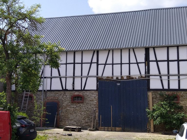 Die Gefache der Scheune wurden wieder gefestigt und teilweise komplett neu mit Lehmstacken geschlosssen, anschließen mit Kalkputz verputzt und freskal gefasst.
